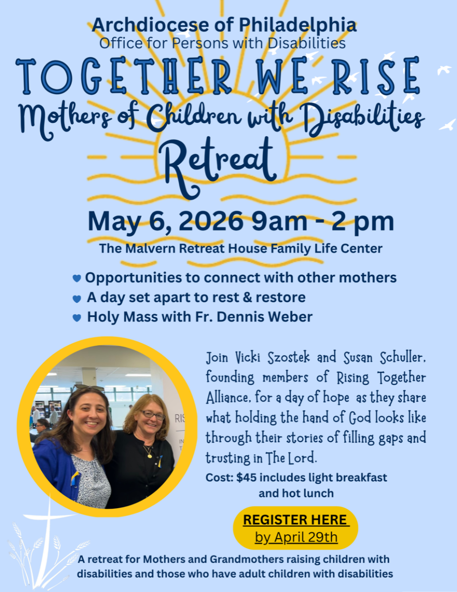 The Mothers of Children with Disabilities Retreat: Together We Rise is on Wednesday, May 6, 2026, from 9:00 AM to 2:00 PM at Malvern Retreat House. Vicki Szostek and Susan Schuller will lead a retreat for mothers and grandmothers who are raising children with disabilities and those who have adult children with disabilities. Vicki and Susan are two of the founding mothers of the Rising Together Alliance, a local organization advocating for inclusive Catholic Education. The day will include a presentation by Vicki and Susan, time for quiet prayer and Confession, opportunities to connect with other mothers, and Holy Mass with Fr. Dennis Weber. For more information or to register by phone, please contact Malvern Retreat House at 610-644-0400. Please register by April 29.
